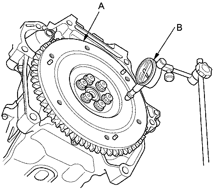 15. Measure the flywheel (A) runout using a dial indicator (B). Through at least two full turns with pushing against the flywheel each time you turn it to take up the crankshaft thrust washer clearance. If the measurement is not within the standard, replace the flywheel, and recheck the runout. Go to step 16.