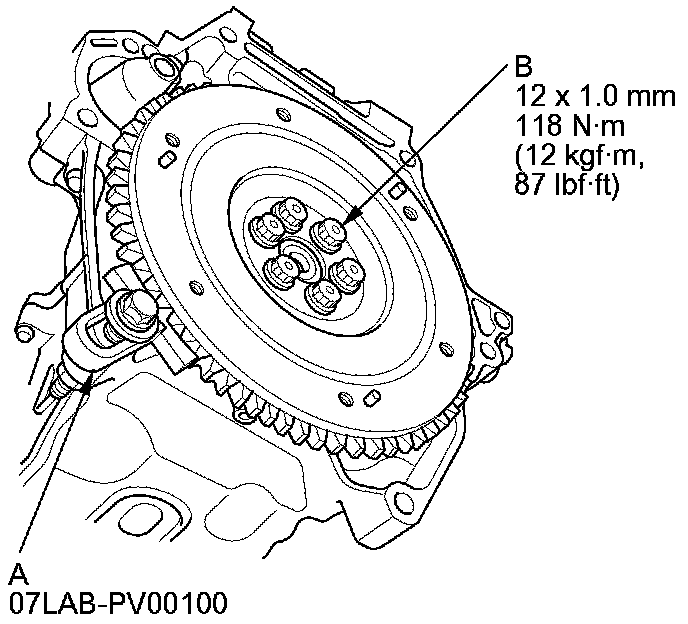 19. Install the ring gear holder (A), then torque the flywheel mounting bolts (B) in a crisscross pattern in several steps.