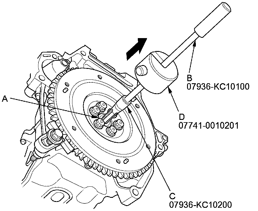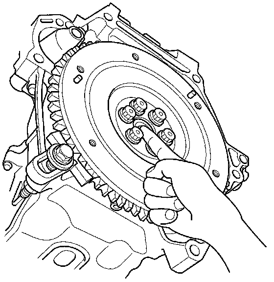 17. Loosen the flywheel mounting bolts in a crisscross pattern in several steps. Remove the bolts, then remove the flywheel and the ring gear holder.