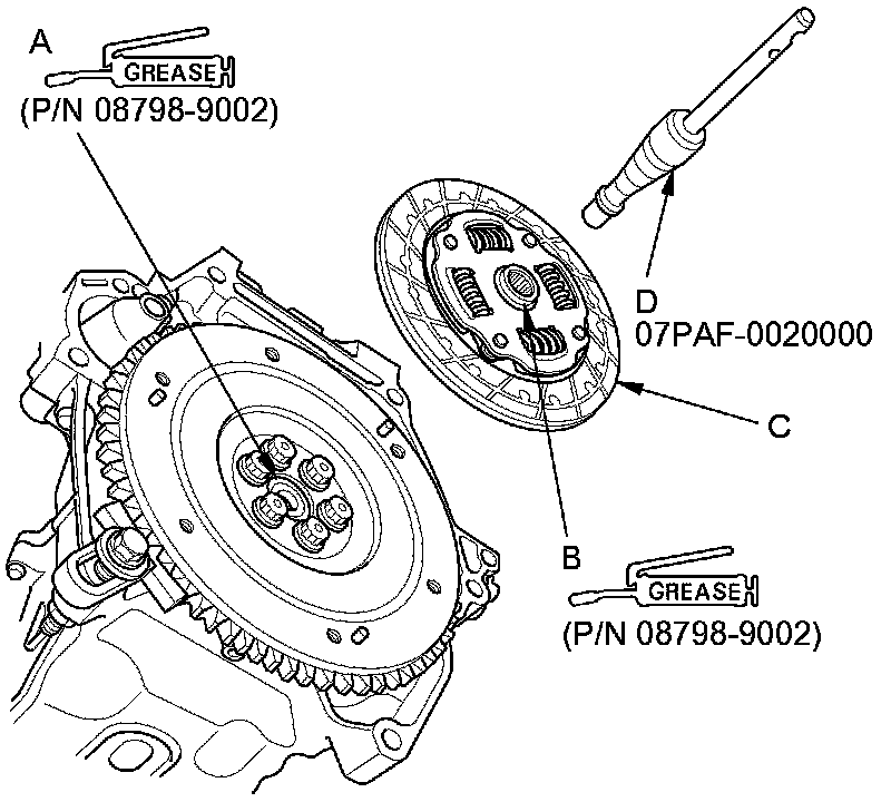 26. Apply super high temp urea grease (P/N 08798-9002) to the splines (B) of the clutch disc (C), then install the clutch disc using the clutch alignment tool set (D).