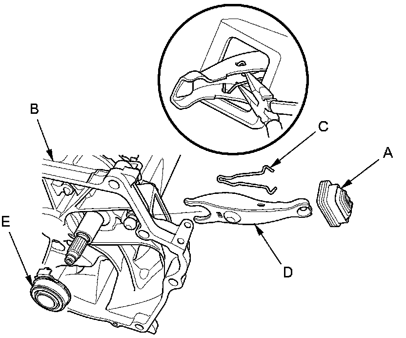 3. Squeeze the release fork set spring (C) with pliers to remove the release fork (D) from the clutch housing. Remove the release bearing (E).