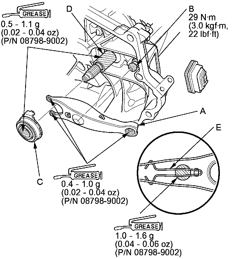 5. Apply high temp urea grease (P/N 08798-9002) to the release fork (A), the release fork bolt (B), the release bearing (C), and the release bearing guide (D) in the shaded areas, then set the release fork set spring (E).