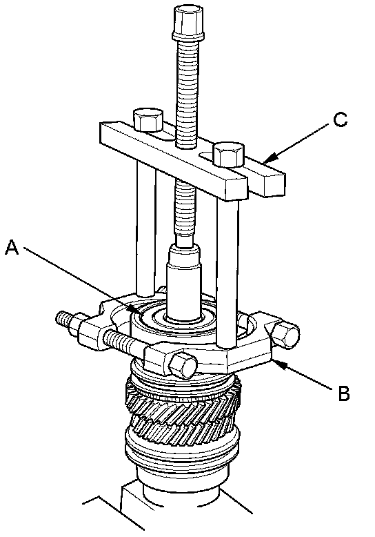 1. Remove the angular ball bearing (A) using the bearing separator set (B) and bearing puller (C).