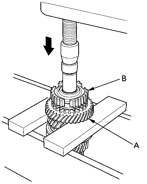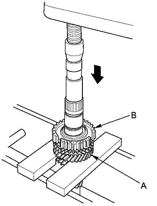 3. Support 5th gear (A) on steel blocks, and press the mainshaft out of the 5th synchro hub (B).