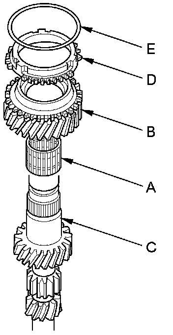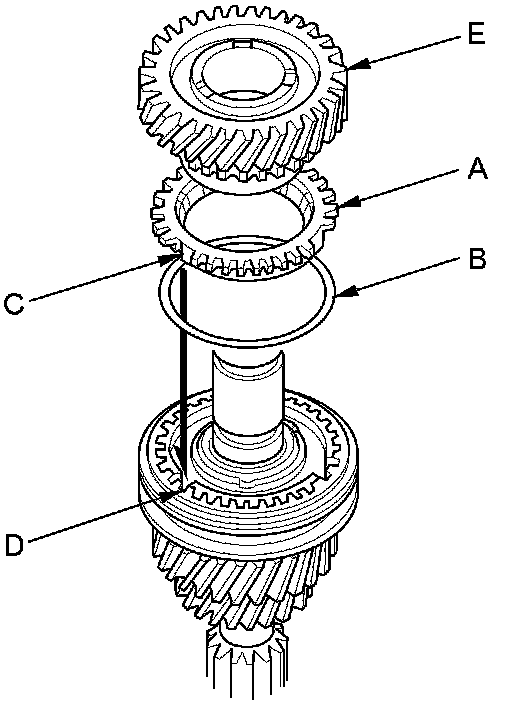 3. Install the synchro ring (D) with the synchro spring (E) onto 3rd gear.