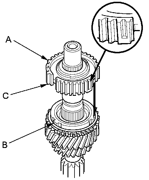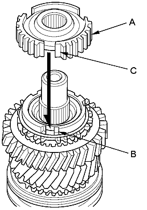 11. Install the 5th synchro hub (A) by aligning the synchro ring fingers (B) with the grooves (C) in the 5th synchro hub.