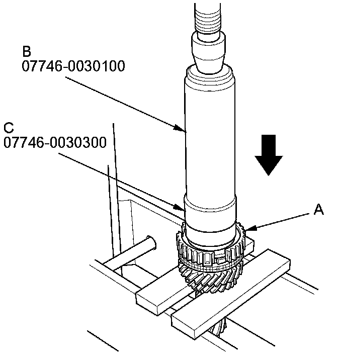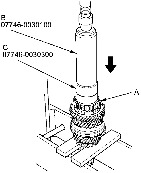 12. Press on the 5th synchro hub (A) using the 40 mm inner driver handle (B) and the 30 mm inner bearing driver attachment (C).