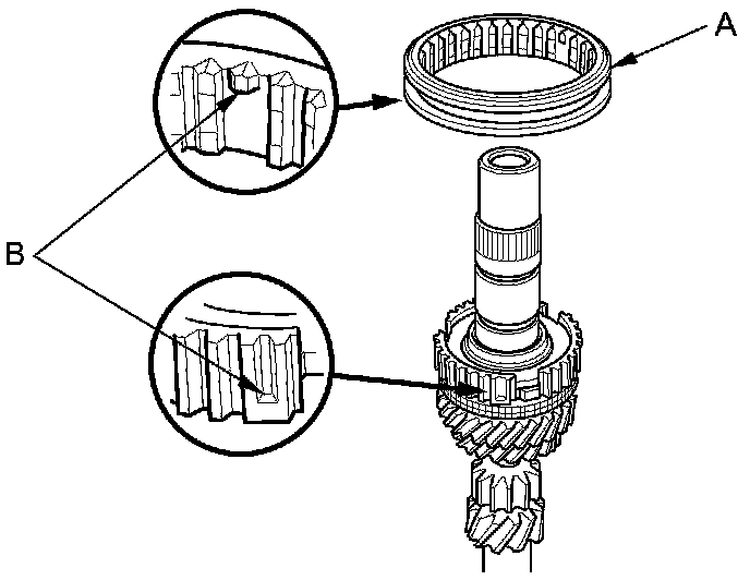 13. Install the 5th synchro sleeve (A) by aligning the slots of the 5th synchro sleeve and the 5th synchro hub (B). After installation, check the operation of the 5th synchro hub set.