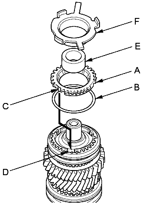 14. Install the synchro ring (A) with the synchro spring (B) by aligning the synchro ring fingers (C) with the grooves (D) in the 5th synchro hub.