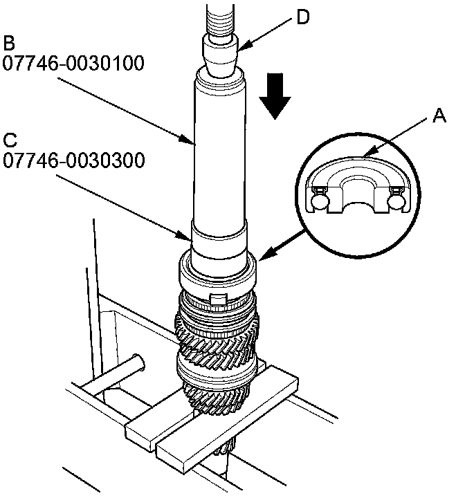 5. Press on the 3rd/4th synchro hub (A) using the 40 mm inner driver handle (B) and the 30 mm inner bearing driver attachment (C).