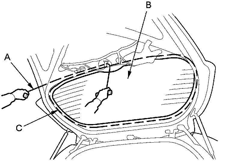 6. With a helper on the outside, pull the piano wire (A) back and forth in a sawing motion. Hold the piano wire as close to the rear window (B) as possible to prevent damage to the tailgate, and carefully cut through the adhesive (C) around the entire rear window.