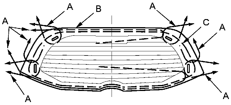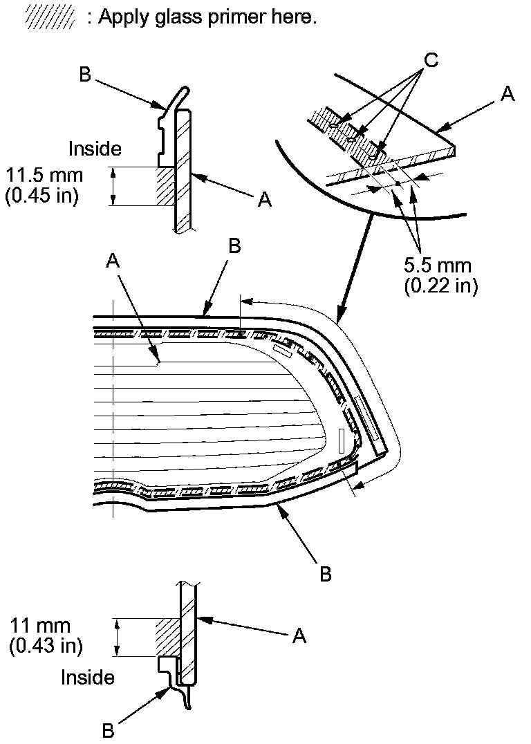 11. Apply glass primer to the inside face of the rear window (C) as shown, and let the primer dry, then attach rubber dams A and B with adhesive tape to the inside face of the rear window.
