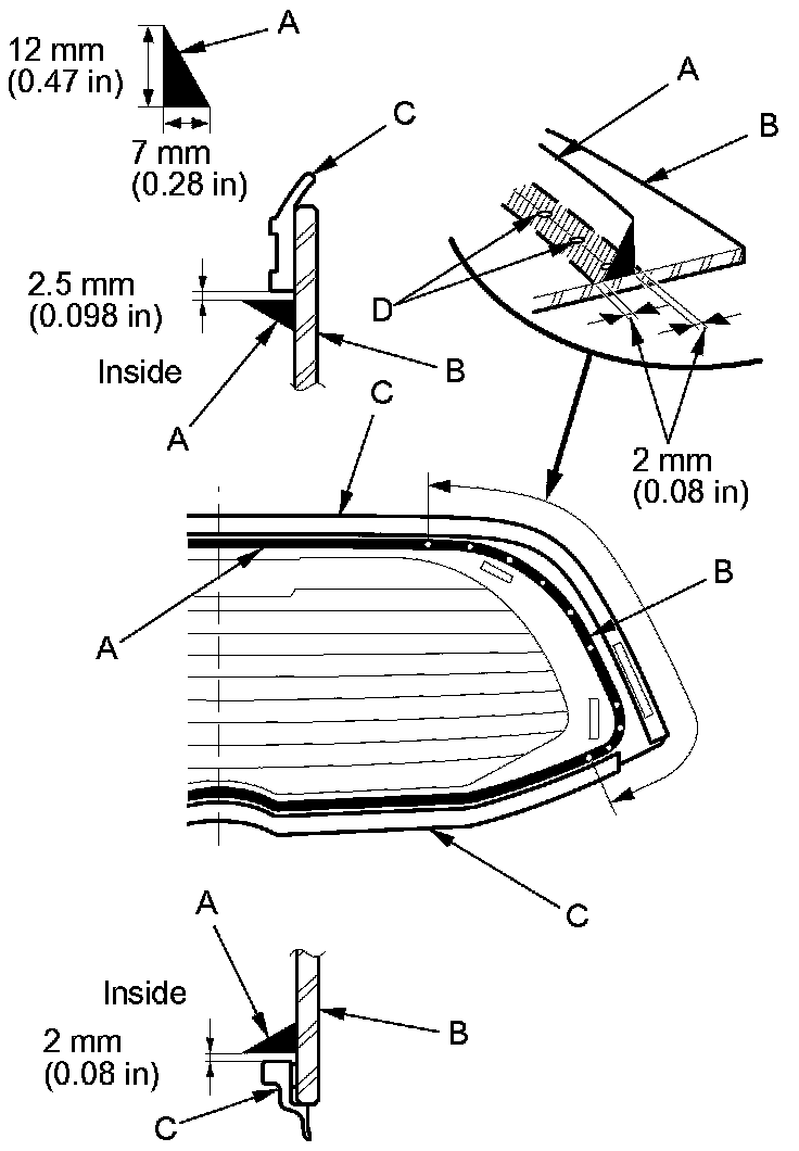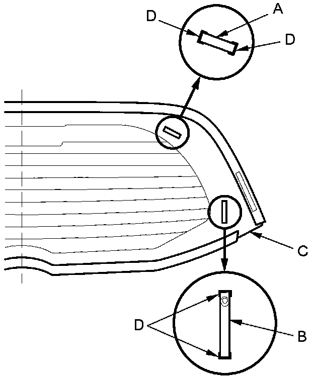 20. Put the cartridge in a caulking gun, and run a continuous bead of adhesive (A) around the edge of the rear window (B) and along the rubber dams (C) as shown. Apply the adhesive to both side portions of the rear window, using the printed dots (D) on the rear window as a guide. Apply the adhesive within 30 minutes after applying the glass primer. Make a slightly thicker bead at each corner.