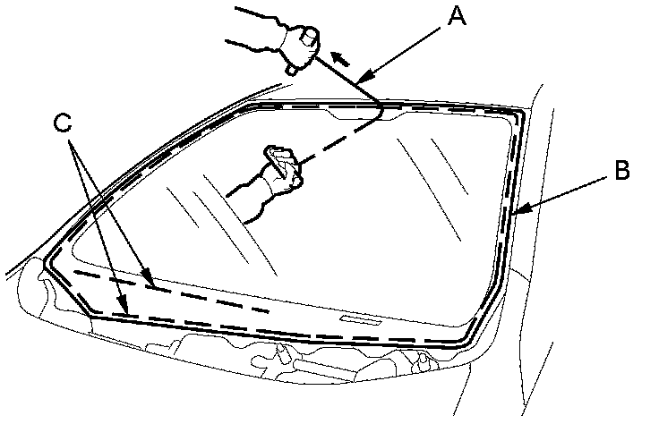 Carefully cut through the rubber dam and adhesive (C) around the entire windshield.