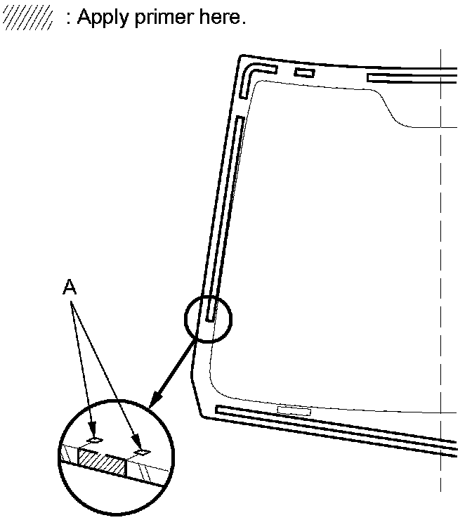 12. Apply a light coat of glass primer to the windshield edges where you will install the new molding. Use the alignment marks (A) as a guide. After the primer dries, lightly wipe it off with gauze or cheesecloth.