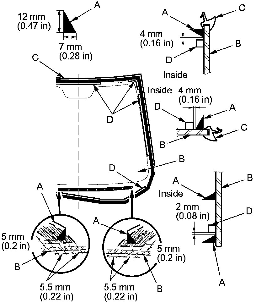 19. Put the cartridge in a caulking gun, and run a continuous bead of adhesive (A) on the windshield (B) along the edge of the molding (C) and rubber dams (D) as shown. Apply the adhesive within 30 minutes after applying the glass primer. Make a slightly thicker bead at each corner.