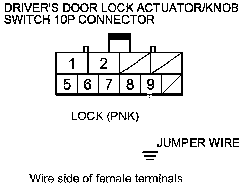 3. Connect driver's door lock actuator/knob switch 10P connector terminal No. 9 and body ground with a jumper wire.