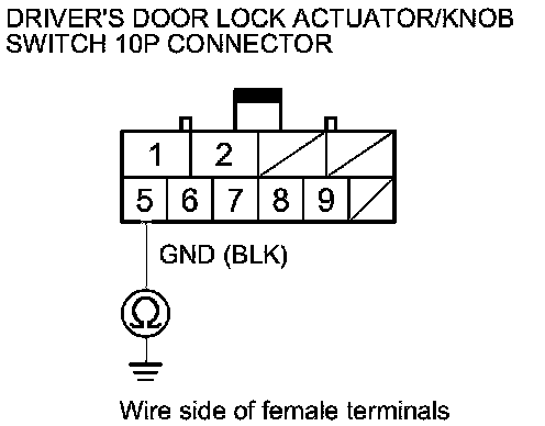 7. Check for continuity between driver's door lock actuator/knob switch 10P connector terminal No. 5 and body ground.