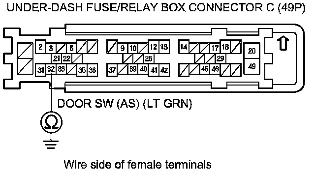 8. Check for continuity between under-dash fuse/relay box connector C (49P) terminal No. 32 and body ground.