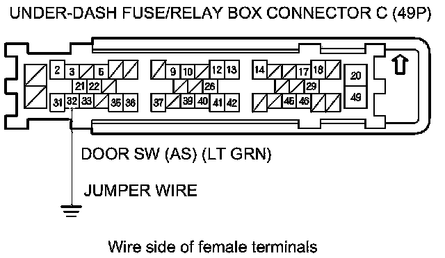 12. Connect under-dash fuse/relay box connector C (49P) terminal No. 32 and body ground with a jumper wire.