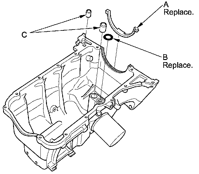 3. Install the new oil pan gasket (A), the new O-ring (B), and the dowel pins (C) on the oil pan.