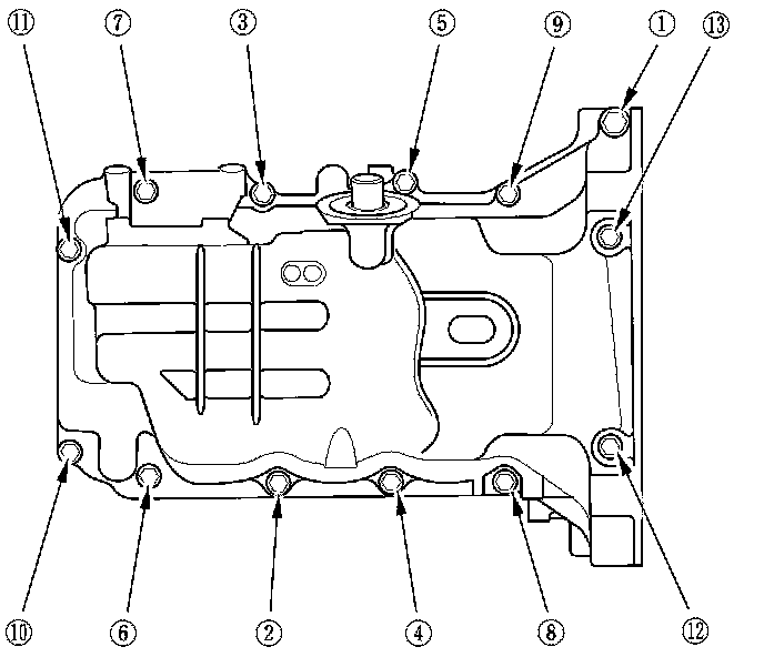 1. Remove all of the old liquid gasket from the oil pan mating surfaces, the bolts, and the bolt holes.