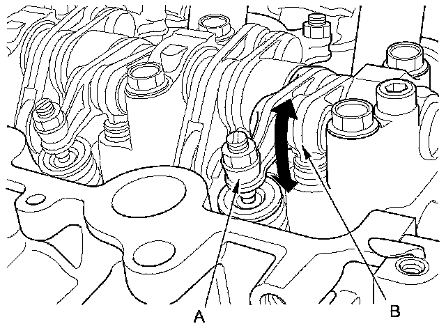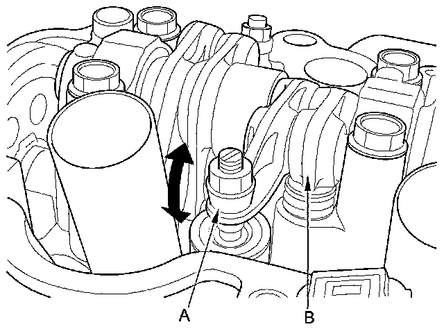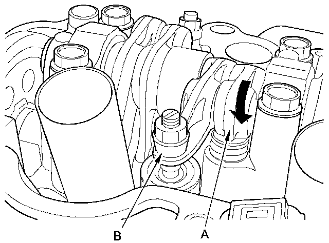 4. Push on the intake primary rocker arm (A) for the No. 1 cylinder. Make sure that the intake primary rocker arm and the intake secondary rocker arm (B) are mechanically connected by the rocker arm pistons and that the intake secondary rocker arm does not move when pushed manually: