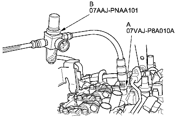 8. Install the VTEC air adapter (A) to the inspection hole, then connect the air pressure regulator (B).