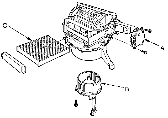 - The recirculation control motor (A), blower motor (B), and the dust and pollen filter (C) can be replaced without removing the blower unit.