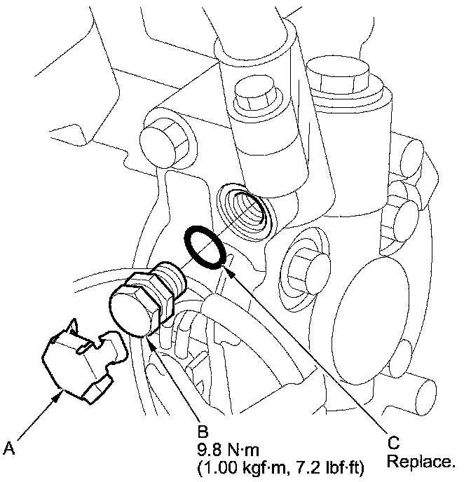 2. Remove the relief valve cover (A), the relief valve (B), and the O-ring (C). Plug the opening to keep foreign matter from entering the system and the A/C compressor oil from running out.