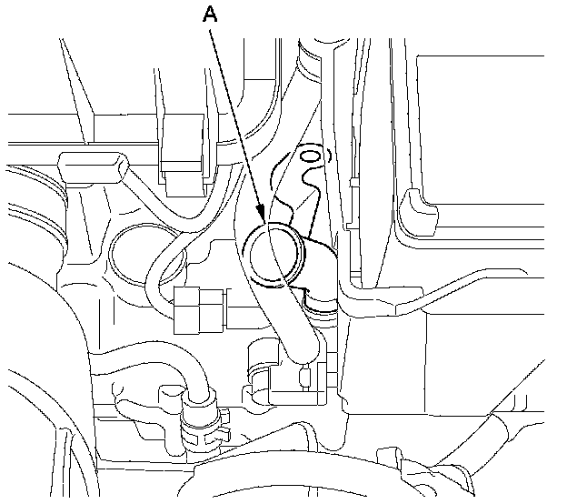 8. If necessary, fill the transmission with CVTF through the dipstick tube opening (A) to bring the fluid level between the upper mark and the lower mark of the dipstick. Do not fill the fluid above the upper mark. Always use Honda CVT fluid (CVTF). Using a non-Honda CVTF can affect shift quality.