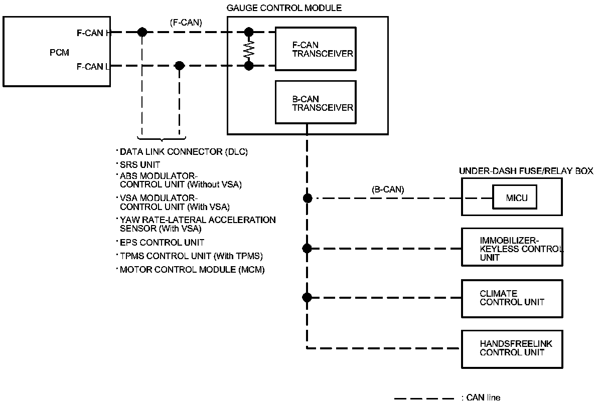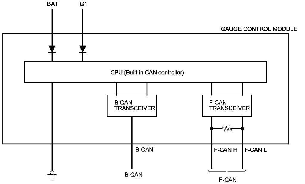 The body controller area network (B-CAN) and the fast controller area network (F-CAN) share information between multiple electronic control units (ECUs). B-CAN communication moves at a slower speed (33.33 kbps) for convenience related items and for other functions. F-CAN information moves at a faster speed (500 kbps) for "real time" functions such as fuel and emissions data. To allow both systems to share information, the gauge control module translates and relays the information from B-CAN to F-CAN and from F-CAN to B-CAN. This is called the Gateway Function.