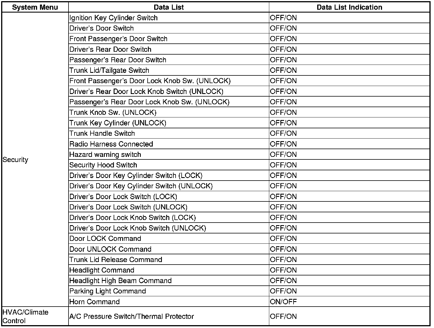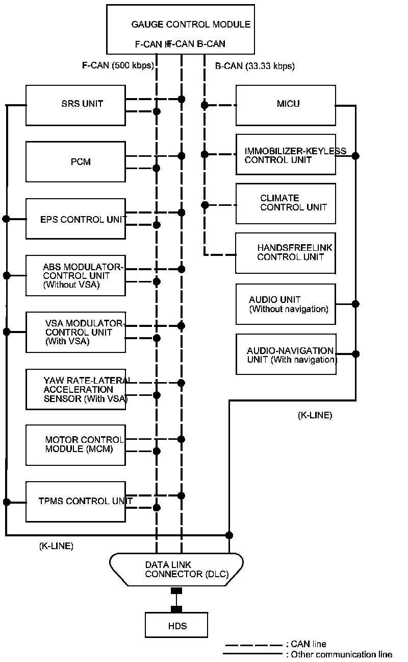 By connecting the HDS to the data link connector (DLC), the HDS can retrieve the diagnostic information from the MICU via a diagnostic line called the K-LINE. The K-LINE is a separate communication line from the CAN lines, but it is connected to most of the CAN related ECUs. The MICU is a gateway between the HDS and B-CAN related ECUs, and sends B-CAN diagnostic information to the HDS. When doing a function test with the HDS, the HDS sends an output signal through the K-LINE to the MICU. The MICU either relays the request to another ECU, or commands the function itself.