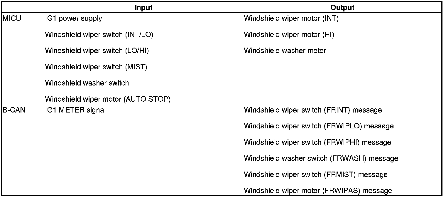 The MICU control of the windshield wiper motor and the windshield washer motor is based on inputs from each switch and B-CAN data.