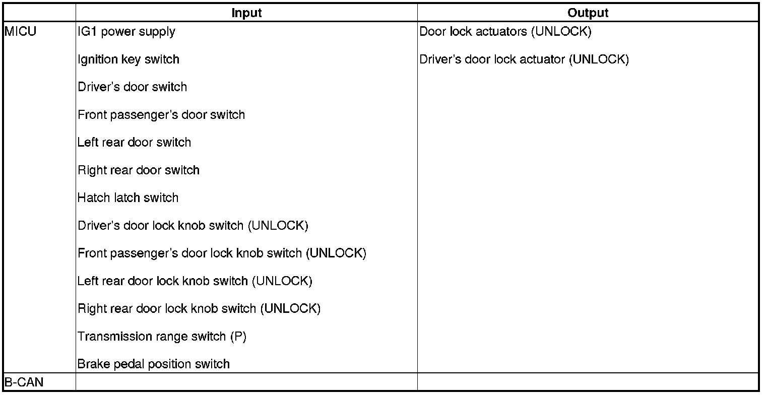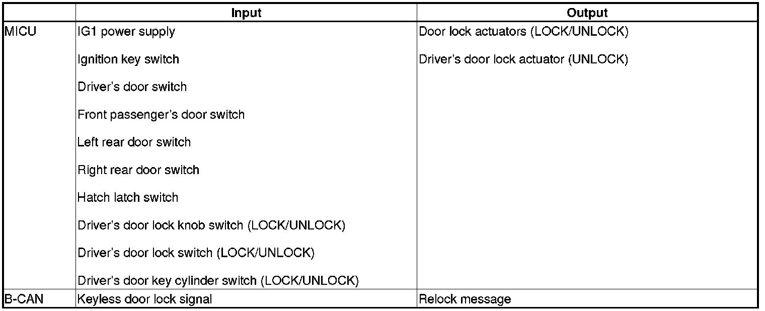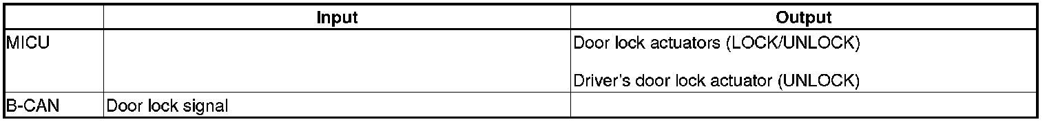The MICU control of the door lock actuators is based on inputs from each switch and B-CAN data.