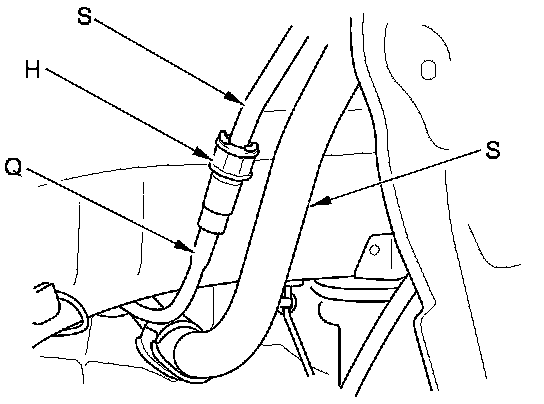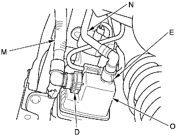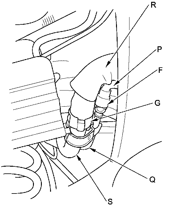 The fuel line/quick-connect fittings (A, B, C, D, E, F, G, and H) connect the fuel feed hose (I) to fuel feed line (J), the fuel line (K) to the fuel tank unit (L), the fuel vent tube (M) to fuel tank unit, the fuel purge line (N) to the EVAP canister (O), the fuel vent tube to EVAP canister, the fuel tank vapor recirculation tube (P) to vapor control valve tube (Q), the fuel fill neck tube (R) to the fuel fill pipe (S), the vapor control valve tube to the fuel fill neck tube, and when removing or installing the fuel feed hose, the fuel tank unit, or the fuel tank, or when disconnecting/connecting the quick-connect fittings, pay attention to the following: