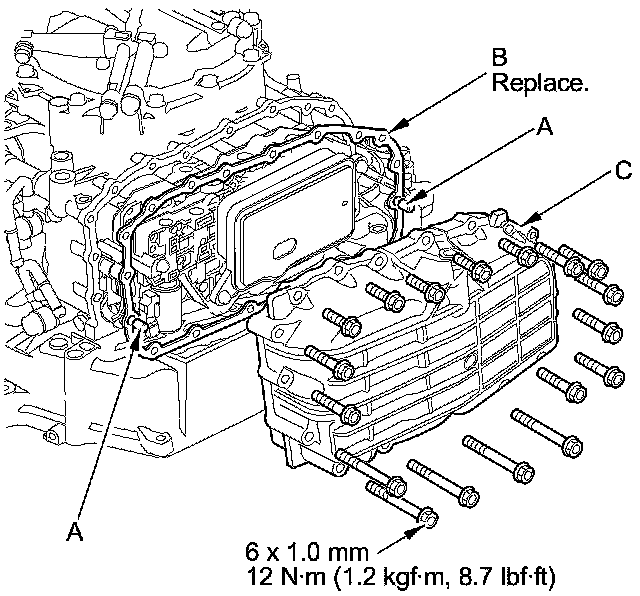 1. Install new O-rings (A) on the CVTF feed pipes (10.9 x 56 mm) (B), then install them with the filter ends into the transmission housing (C).