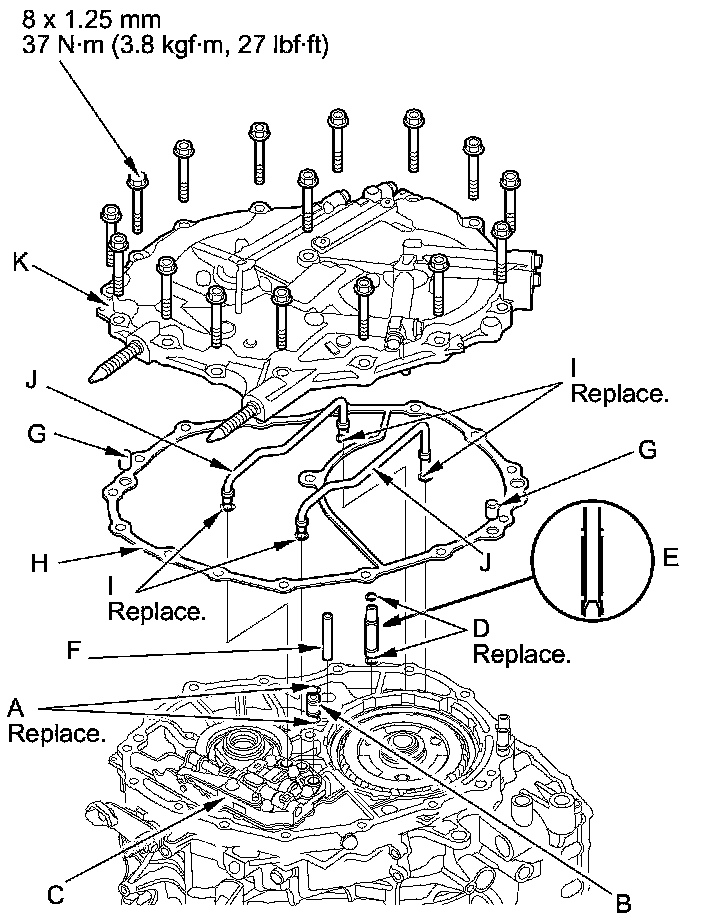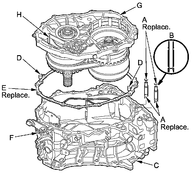 2. Install the two dowel pins (D) and a new gasket (E) on the transmission housing.