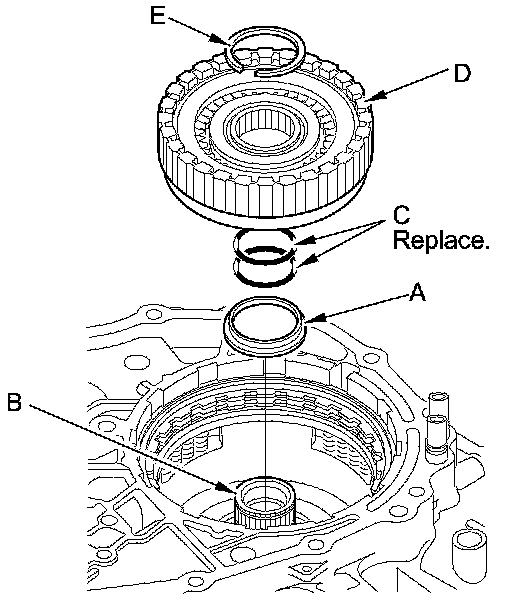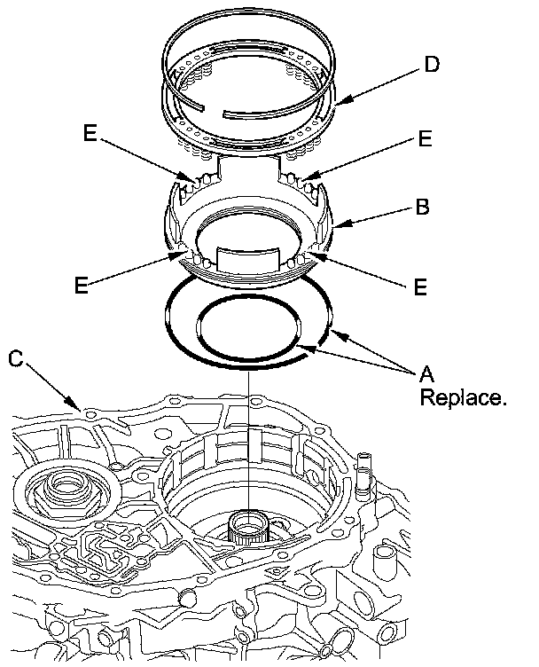 26. Install the input shaft/planetary carrier assembly (C) through the drive pulley shaft (D) by aligning the sun gear (E) with the forward clutch discs and aligning the planetary carrier with the reverse brake discs.