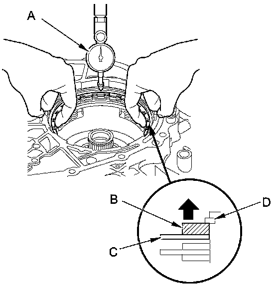 15. Zero the dial indicator by lifting the top disc (C) up against the reverse brake end-plate and the reverse brake end-plate up against the snap ring (D).
