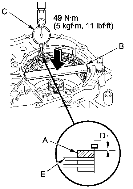 17. Press the steel plate down with 49 N (5 kgf, 11 lbf) using a force gauge, and read the dial indicator (C). The dial indicator reads the clearance (D) between the reverse brake end-plate and the top-disc (E). Take measurements in at least three places, and use the average as the actual clearance.