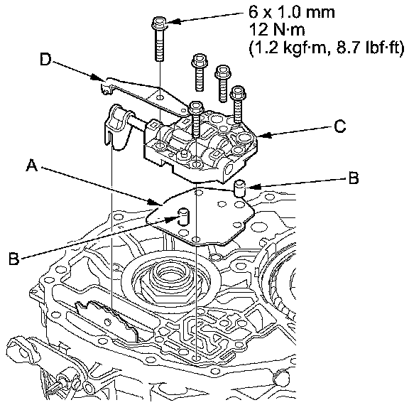 27. Install the manual valve body separator plate (A) and the two dowel pins (B) on the intermediate housing, then install the manual valve body (C) and detent spring (D).