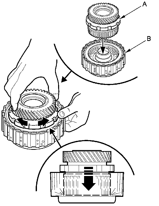 35. Insert the secondary drive/park gear (A) into the start clutch (B). Wiggle the secondary drive/park gear back and forth as it goes into the start clutch, and push in the secondary drive/park gear until it bottoms out.