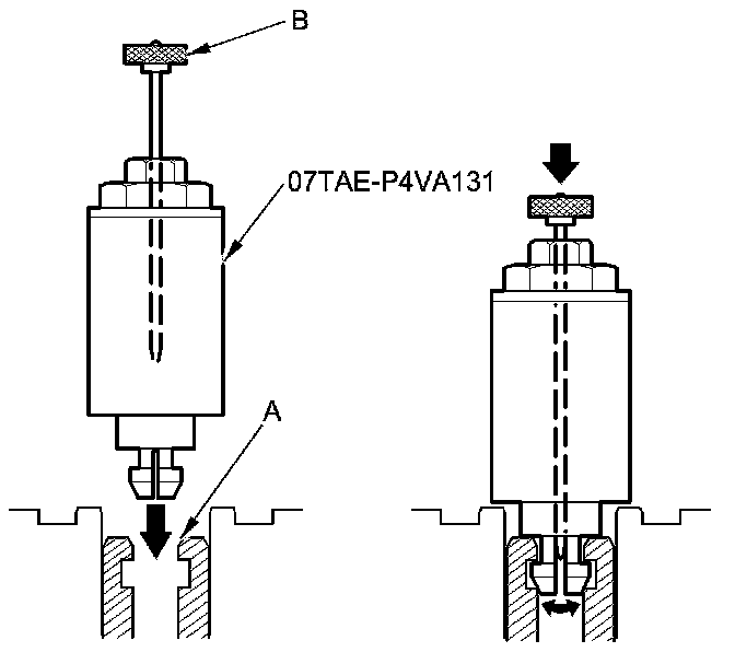 40. While holding the handle (A) down, push down the bottom part (B) of the start clutch installer until it contacts the seating surface of the start clutch.