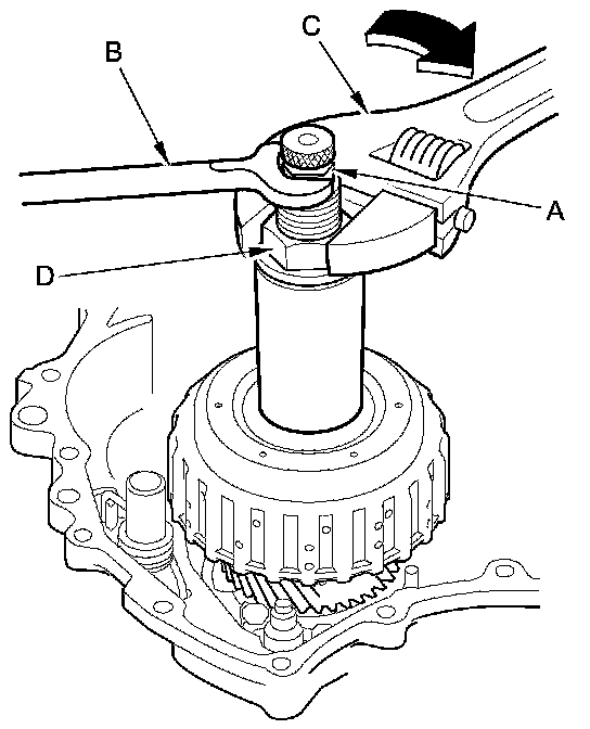 41. Hold the upper hex section (A) of the start clutch installer with a 19 mm wrench (B), then use an adjustable wrench (C) to tighten the start clutch installer's lower nut (D) until the start clutch seats.