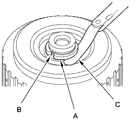 5. Install two new O-rings (A) on the reverse brake piston (B), then install the piston in the intermediate housing (C).