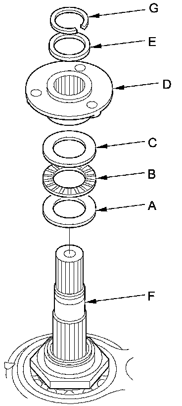 49. Install the thrust washer (A), the thrust needle bearing (B), the thrust washer (C), the CVTF pump drive sprocket hub (D), and the 22 x 28 mm thrust shim (E) on the input shaft (F), and install the snap ring (G) to secure them.