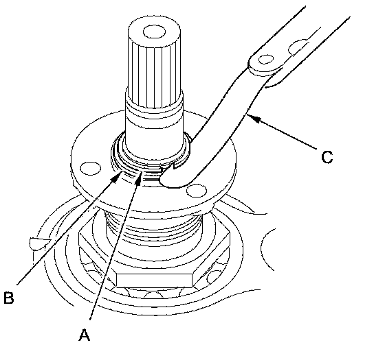 51. Measure the clearance between the 22 x 28 mm thrust shim (A) and the snap ring (B) using a feeler gauge (C). Take measurements in at least three places, and use the average as the actual clearance.