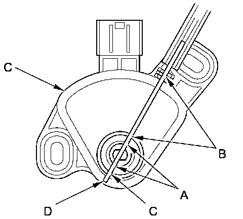 71. Align the cutouts (A) on the rotary-frame with the neutral positioning cutouts (B) on the transmission range switch (C). Then put a 2.0 mm (0.08 in) feeler gauge blade (D) in the cutouts to hold the switch in the N position.