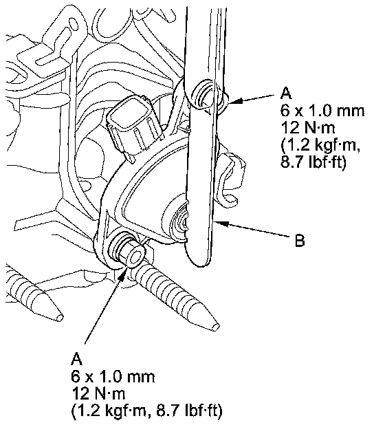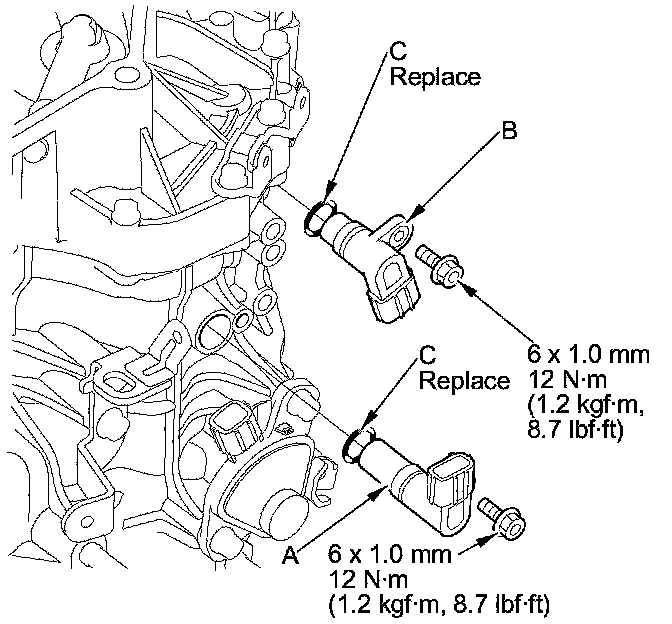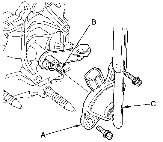 76. Install the CVT output shaft (driven pulley) speed sensor (A), and the vehicle speed sensor (B), with new O-rings (C).